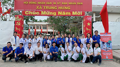 Các thầy thuốc trẻ và đoàn viên thanh niên chụp hình lưu niệm tại buổi khám bệnh phát thuốc miễn phí tại xã Trung Hưng, huyện Cờ Đỏ.