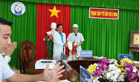 Ông Lê Minh Bạch, Giám đốc Trung tâm Y tế khu vực Ô Môn trao giấy khen cùng hiện vật cho điều dưỡng Nguyễn Tấn Lộc được biểu dương trong phong trào “Người tốt, việc tốt”