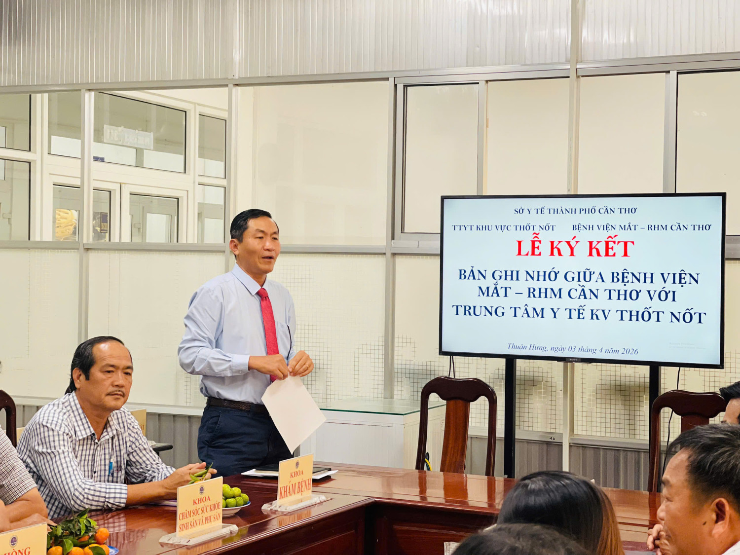 Ngày 03/4/2026, Bệnh viện Mắt - Răng Hàm Mặt TP Cần Thơ và Trung tâm Y tế khu vực Thốt Nốt đã tổ chức ký kết bản ghi nhớ thỏa thuận hợp tác nhằm nâng cao năng lực khám, chẩn đoán và điều trị các bệnh lý về mắt, răng hàm mặt tại tuyến cơ sở.